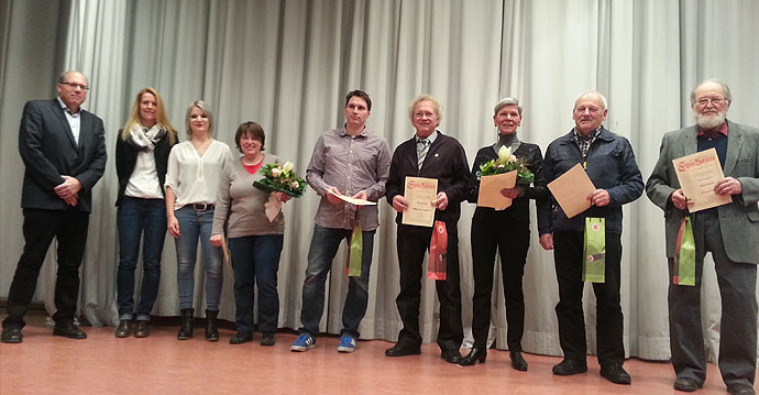Von links: Die TSV-Vorstände Frank Aichele, Melanie Kullen und Bonny Dieckhoff mit den Geehrten.